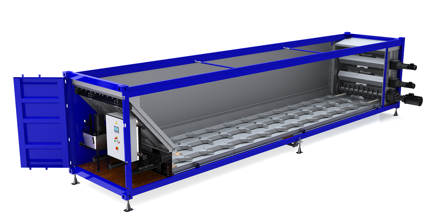 The outer housing is a standardised 40’ open top ISO container, completely clad in stainless steel inside. The mechanics are located behind the container doors, protected from the weather.